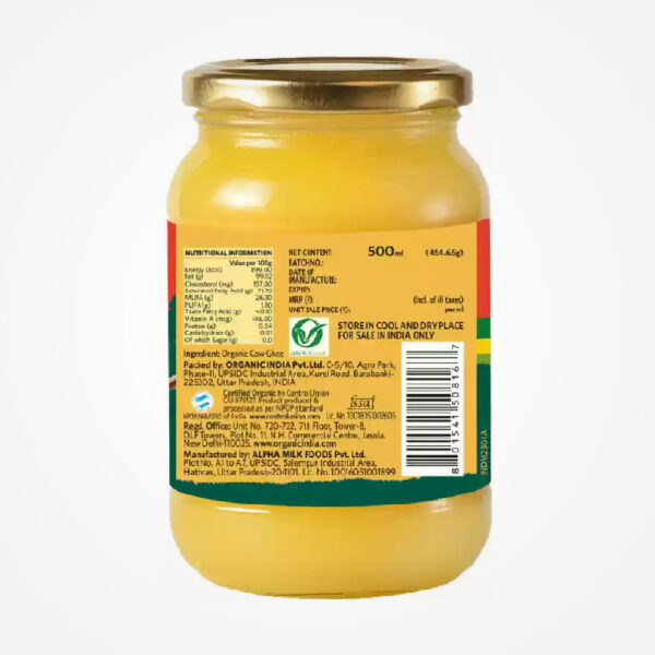 ORGANIC INDIA Cow’s Ghee is made from the milk of cows raised on organic farms with love and compassion. Our ghee is free from chemical pesticides and hormones, ensuring wholesome goodness in every bottle. A naturally rich source of fat-soluble nutrients and healthy fatty acids, ORGANIC INDIA’s Cow Ghee is heat stable & perfect to use for cooking at high temperatures. Packed with vitamins & essential fatty acids. It boosts nutrient absorption & stamina. Promotes healthy joints & skin.